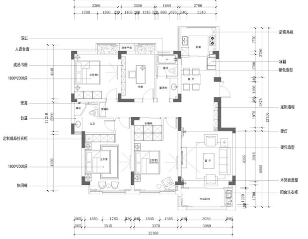 屋主需求: 1、平时二人居住,希望尽可能把起居空间做大。 2、次卧希望能设置为半开放式。 3、没有使用浴缸的习惯,也不太做饭,对厨房要不高。