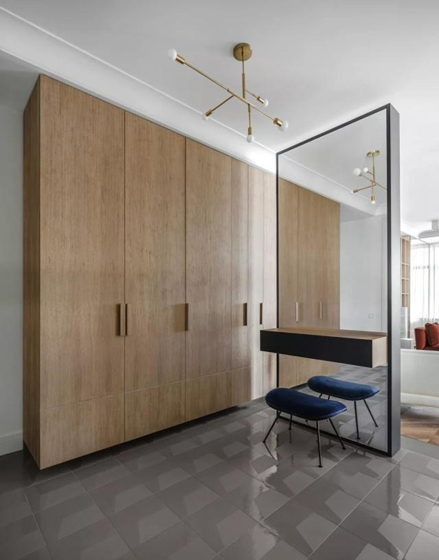 根据屋主真实的生活习惯,我们对空间进行重新布局分配,形成客厅、餐厨一体的起居空间。以沙发中岛台为核心的大动线,和以客厅大立柜为核心的小动线,打造出空间的自由度,放大视觉效果,并且为空间增添了些有趣的探索感。