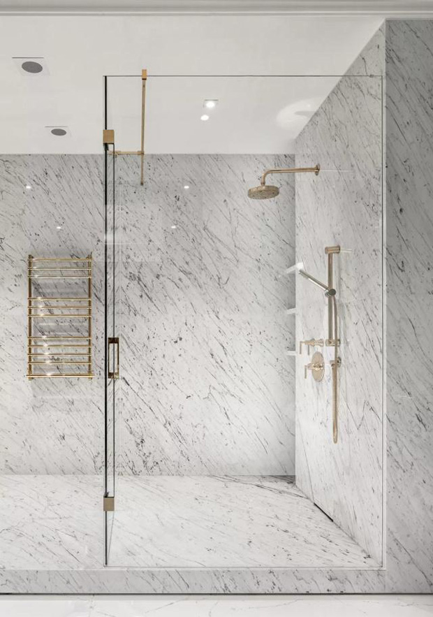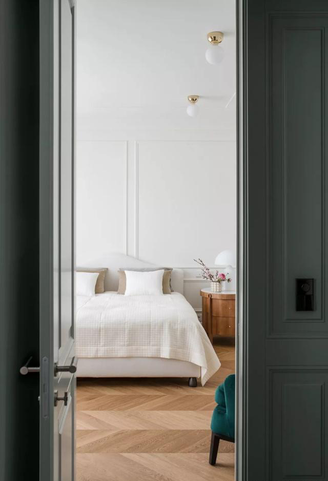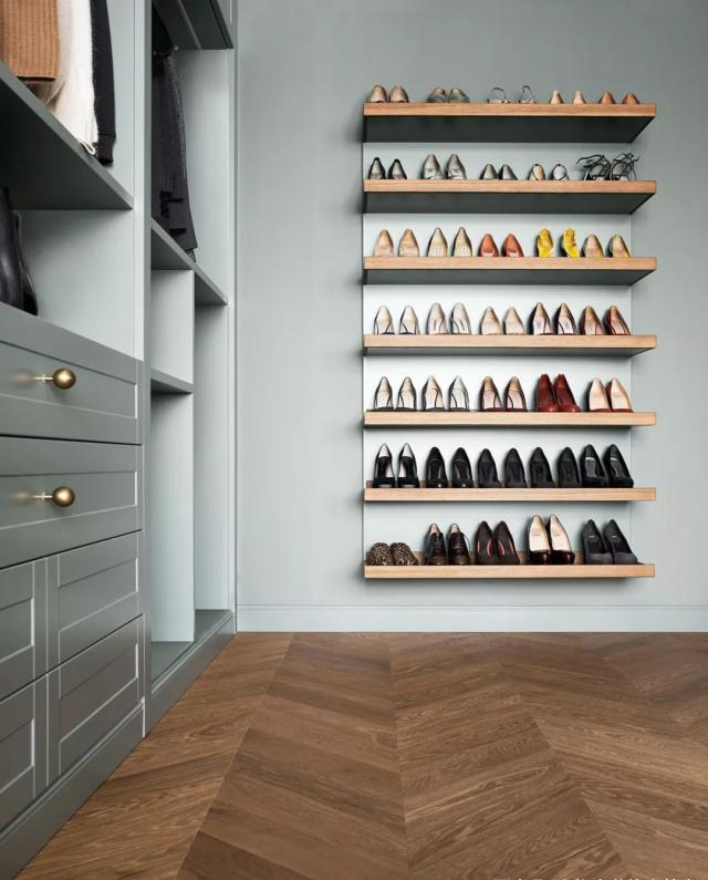 衣帽间的面积非常大,淡绿色的柜体与金色拉手搭配。一盏黄铜吊灯做为照明,大量的衣柜,鞋柜,可以满足任何衣服、鞋子、配饰的摆放。