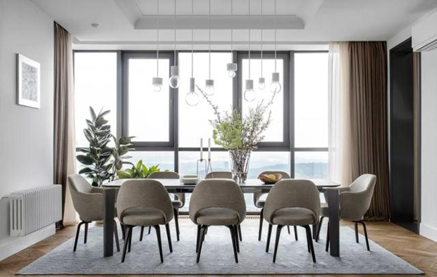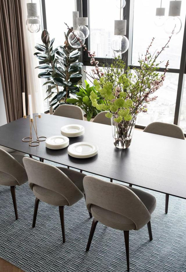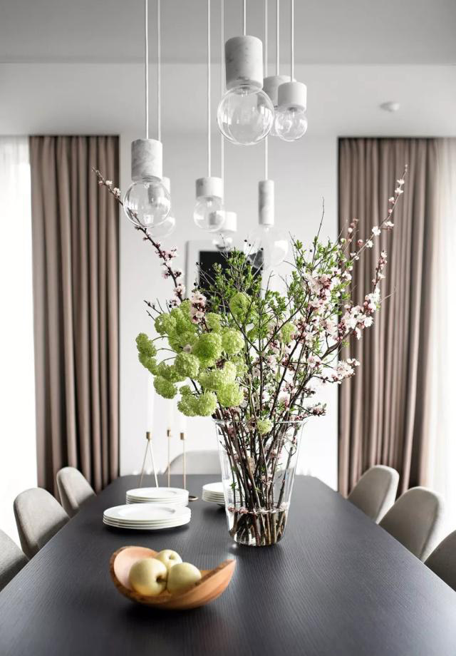 餐厅的采光非常好,黑色的木质餐桌搭配八张餐椅,顶部是一套白色的组合吊灯,大小灯泡、高低错落,很好的渲染了氛围。