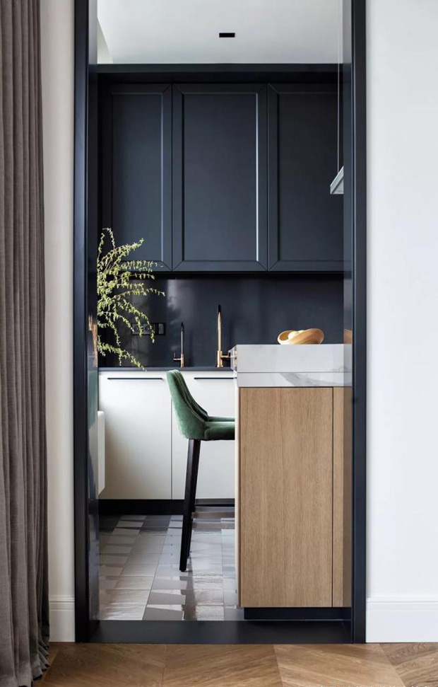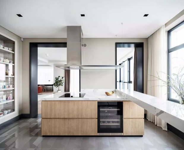 厨房左右两边都有入口,整个动线呈回字形,右边通往是厨房的烹饪区,左边则是吧台。